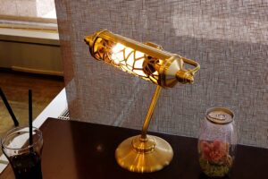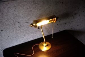 Brass desk light 38灯を光源としたアンティーク調のデスクライト全て真鍮製で作られた高級感あふれる品 パーツの一つ一つを機械加工の職人の手で”削り出し”によって作り出された手間のかかった作り 1/f SPACE のオリジナリティーをインテリアに落とし込んだアイテム